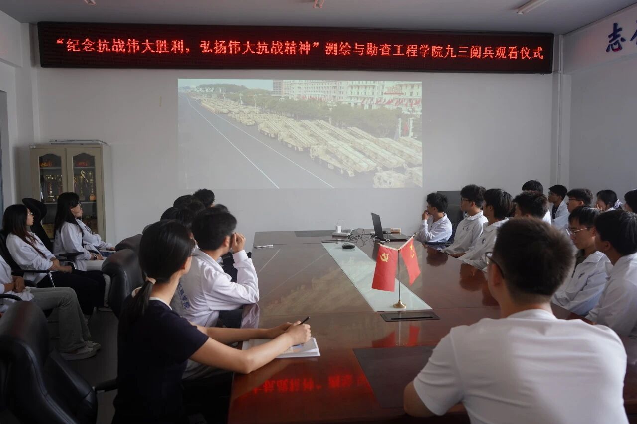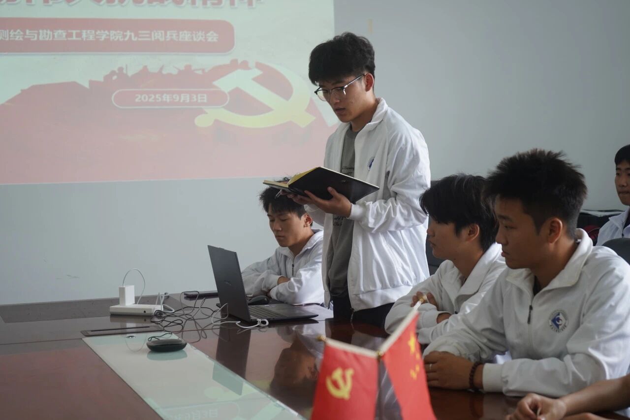 2025年9月3日,是中国人民抗日战争暨世界反法西斯战争胜利80周年的庄严时刻。测绘与勘查工程学院于土木楼A405会议室组织集体观看阅兵仪式直播,并围绕“纪念抗战伟大胜利,弘扬伟大抗战精神”主题开展座谈,重温峥嵘岁月,凝聚奋进力量。